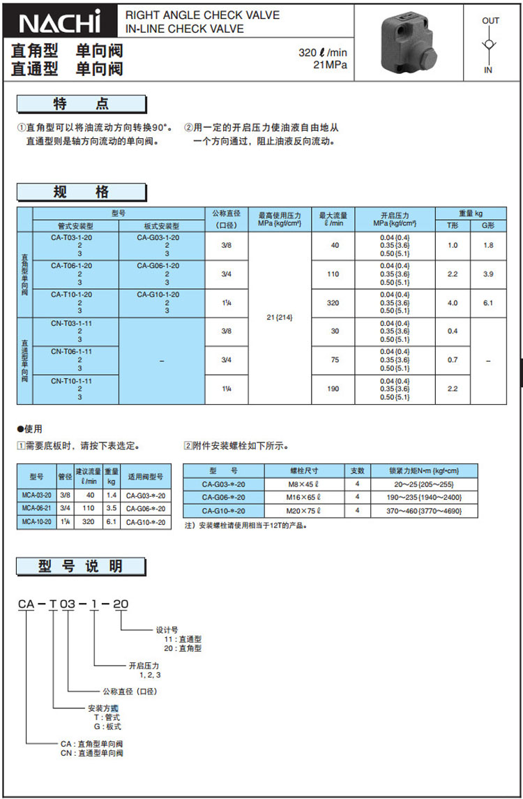 CA-T03,CA-T06,CA-T10,CA-G03,CA-G06,CA-G10,CN-T03,CN-T06,CN-T10,CN-T10-3-11,NACHI單向閥