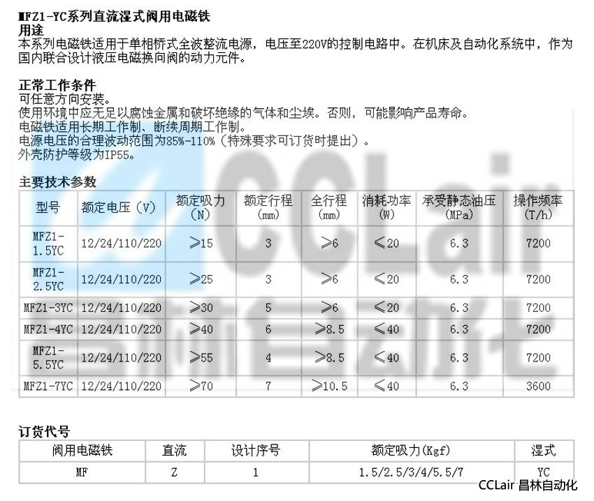 詳細(xì)信息 MFZ1-1.5YC,MFZ1-2.5YC,MFZ1-3YC,直流濕式閥用電磁鐵,昌林直流濕式閥用電磁鐵,直流濕式閥用電磁鐵生產(chǎn)廠家,直流濕式閥用電磁鐵價格,