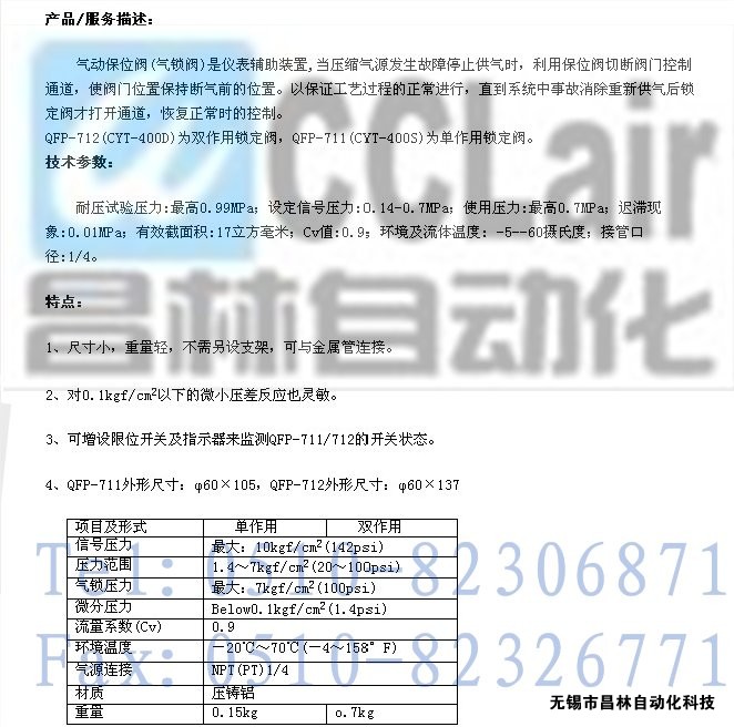 QFB-712,QFB-711,(CYT-400S,CYT-400D),氣動保位閥(氣鎖閥),生產(chǎn)廠家,價(jià)格,昌林氣動保位閥(氣鎖閥),氣動保位閥(氣鎖閥)生產(chǎn)廠家,氣動保位閥(氣鎖閥)價(jià)格