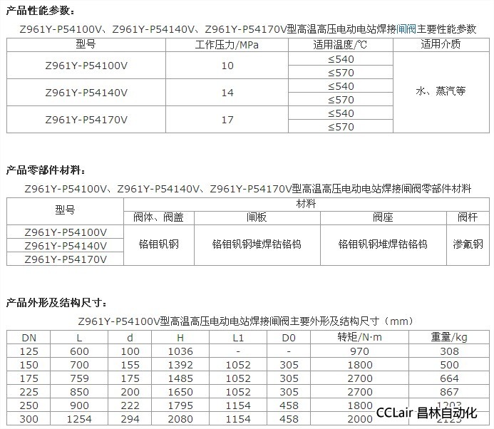 Z961Y-P54100V、Z961Y-P54140V、Z961Y-P54170V型高溫高壓電動(dòng)電站焊接閘閥驅(qū)動(dòng)方式為電動(dòng),連接方式為對(duì)接焊連接形式,閥門為明桿楔式剛性單閘板,閥座密封面材料為鉻鉬釩鋼堆焊鈷鉻鎢合金,工作壓力10MPa~17MPa,閥體材料為鉻鉬釩鋼的高溫高壓電站閘閥。