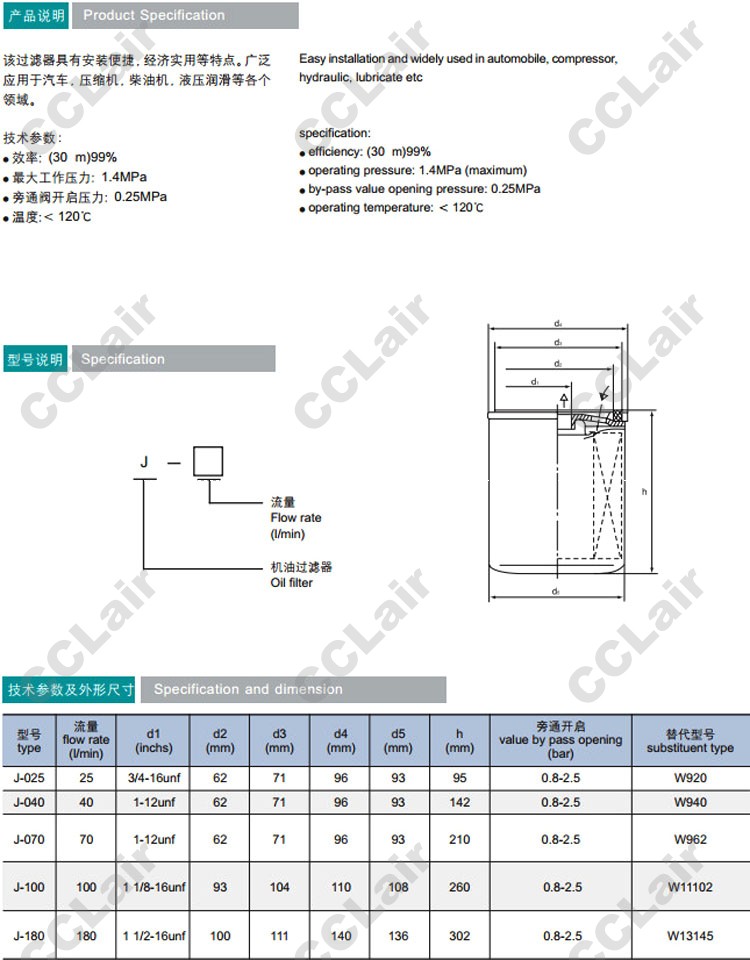 詳細信息 J-025,J-040,J-070,J-100,J-180,旋轉(zhuǎn)式機油過濾器