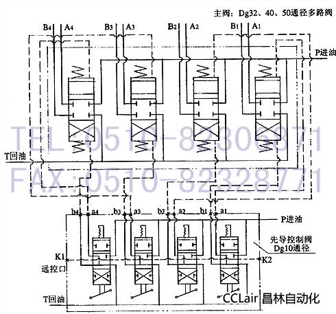 本閥具有公共進(jìn)油口P和回油口T,其油路形式為并聯(lián)油路為主。用一組Dg10通徑的多路換向閥控制操縱主閥換向。操作輕便,換向平穩(wěn)。主閥可放在離執(zhí)行機(jī)構(gòu)近處,Dg10通徑多路閥裝在操縱臺(tái)上,這樣便于安裝,減少管路。