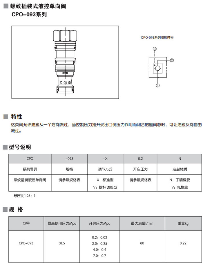 CPO-093-X0.2N,CPO-093-X2.0N,CPO-093-X4.0N,CPO-093-X7.0N,CPO-093-X0.2V,螺紋插裝式液控單向閥
