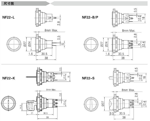 詳細(xì)信息 NF22-L,NF22-B/P,NF22-K,NF22-S,Koino Φ22平面型控制開(kāi)關(guān)