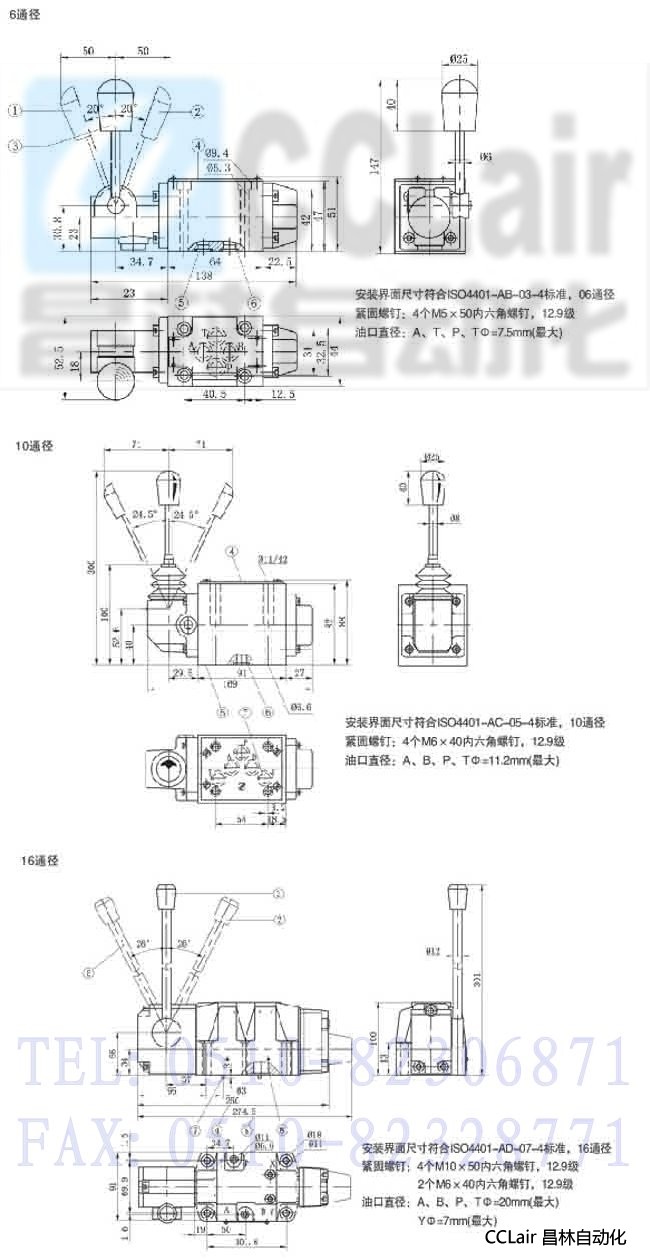 CHD系列手動換向閥有6通徑、10通徑、16通徑等尺寸規(guī)格,安裝底板符合ISO4401標(biāo)準(zhǔn)。