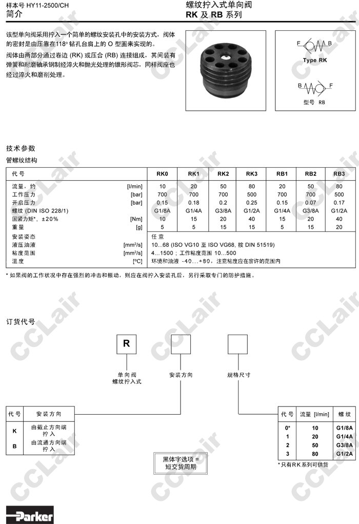 詳細信息 RK0,RK1,RK2,RK3,RB1,RB2,RB3,Parker螺紋擰入式單向閥