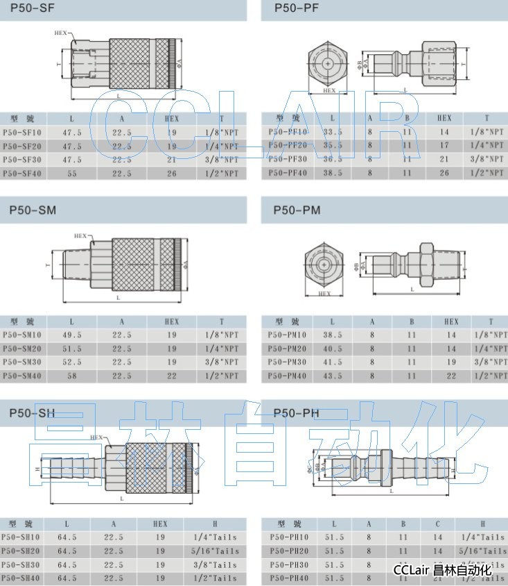 P50-SF10,P50-PF20,P50-SM30,P50-PM40,P50-SH10,P50-PH20,美式快換接頭