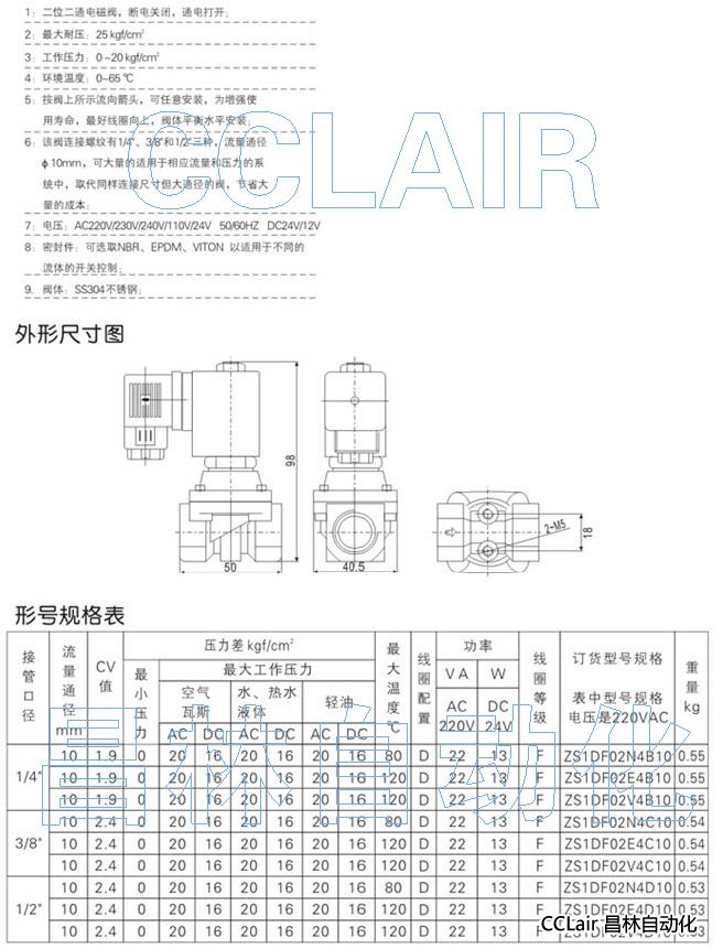 ZS1DF02N4B10,ZS1DF02E4B10,二位二通直動式不銹鋼電磁閥(常閉型)