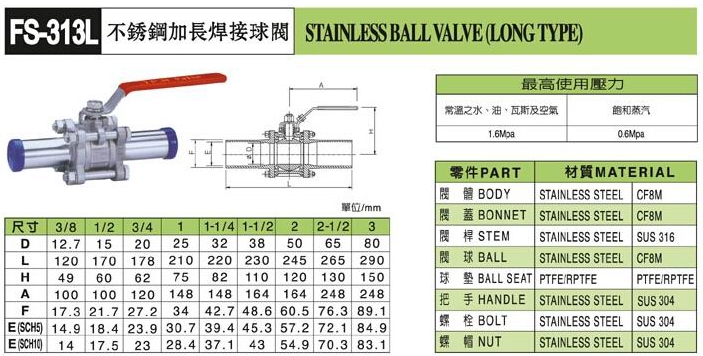 FS-313L不銹鋼加長焊接球閥在各個(gè)領(lǐng)域使用都非常廣泛,其優(yōu)越的品質(zhì)和高性能的穩(wěn)定性是普通鑄鋼球閥所無法達(dá)到的,加長焊接球閥使用壽命遠(yuǎn)遠(yuǎn)大于鑄鋼球閥,富山焊接球閥廣泛應(yīng)用于城市燃?xì)?、城市?熱、石油化工、造船、鋼鐵、調(diào)壓站、發(fā)電廠等各類管道設(shè)備上。