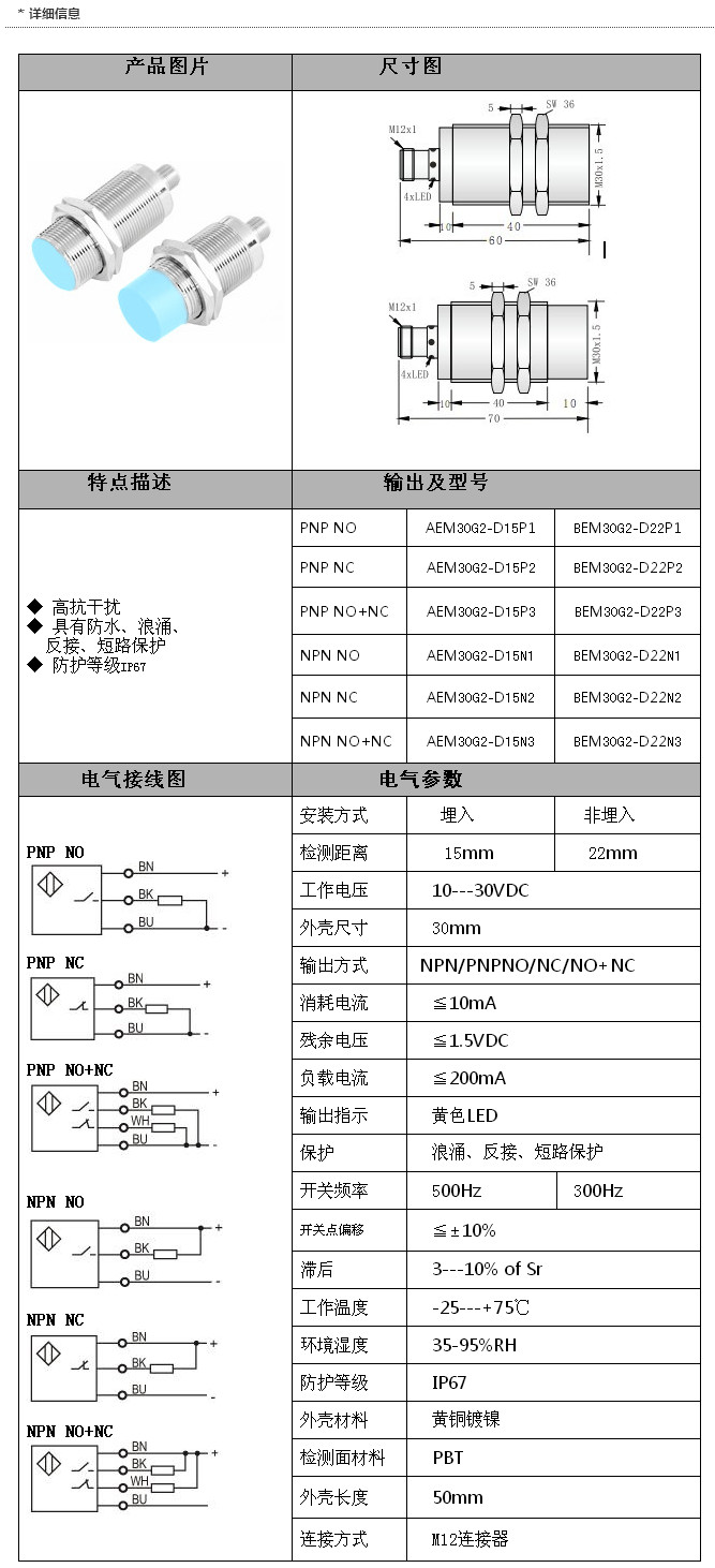 詳細信息  AEM30G2-D15P1,BEM30G2-D22P2,AEM30G2-D15N2,AEM30G2-D15N3,BEM30G2-D22N3,M30接插式接近開關