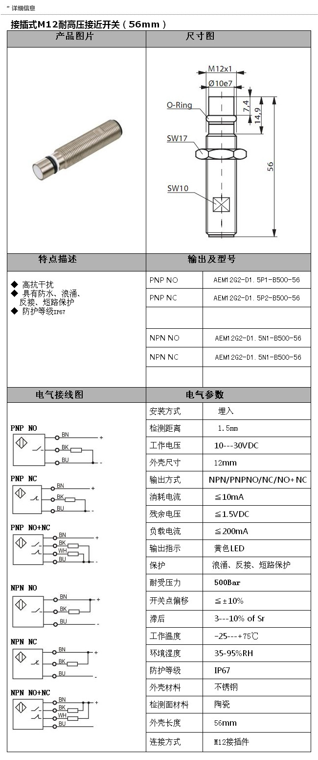 詳細(xì)信息 AEM12G2-D1.5P1-B500-56,AEM12G2-D1.5N1-B500-56,AEM12G2-D1.5N1-B500-56,M12接插式(56mm