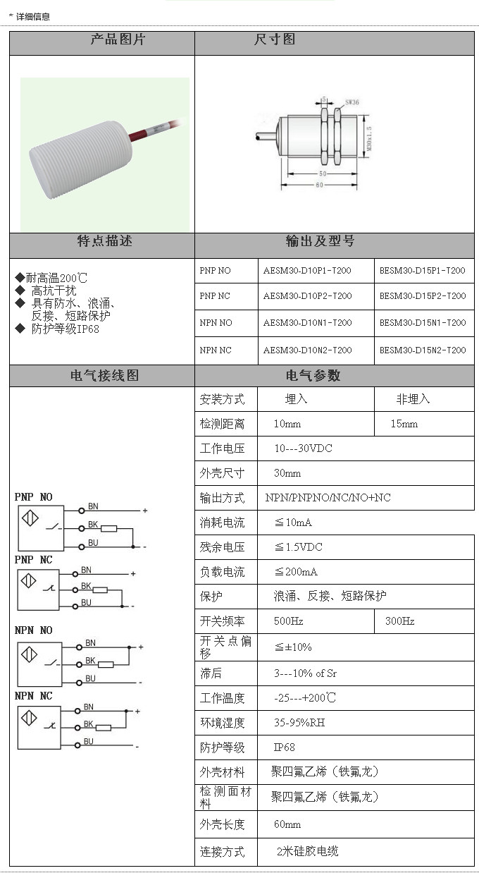 詳細(xì)信息 BESM30-D15P1-T200,AESM30-D10P2-T200,AESM30-D10N2-T200,M30耐溫200℃接近開關(guān)