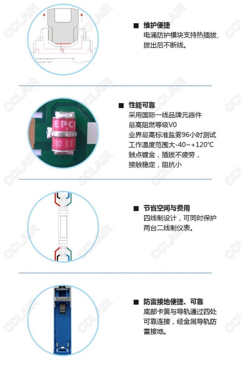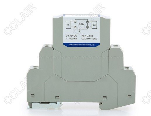 24VDC電源SPD,適合24VDC、電磁閥等電源回路,最大放電電流Imax(8/20us):20kA/線,12.5mm超薄,通過DIN35金屬導軌接地。