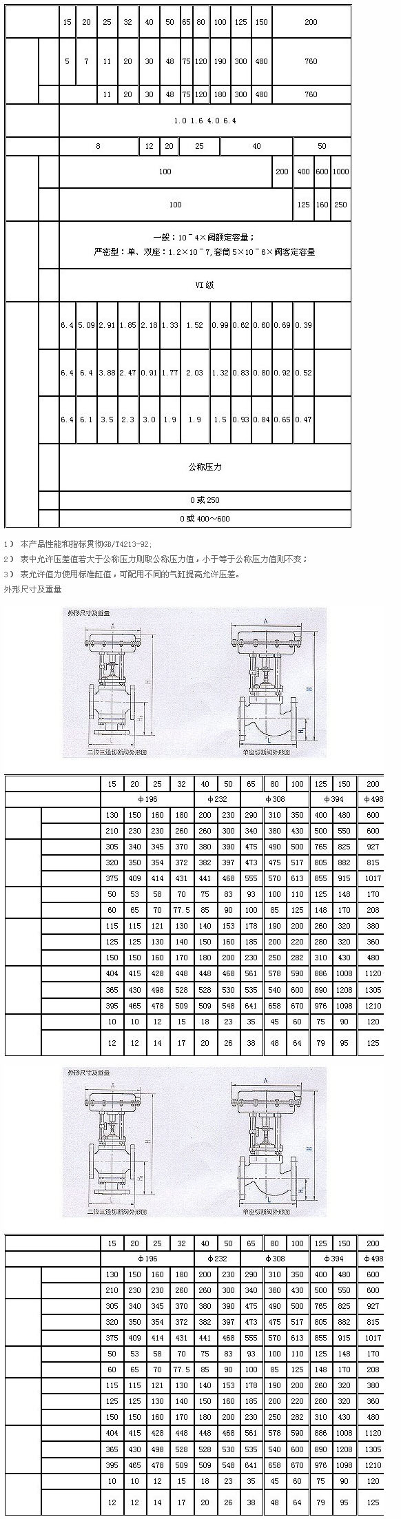 本系列產(chǎn)品有薄膜式、活塞式兩種。閥體結(jié)構(gòu)有單座、套筒、雙座(二位三通)三種,密封形式有填料密封和波紋管密封兩種,產(chǎn)品公稱壓力等級(jí)有PN10、16、40、46四種,公稱口徑范圍DN20~200mm。適用流體溫度由-60~450℃。泄漏量等級(jí)為IV級(jí)或VI級(jí)。流量特性為快開。