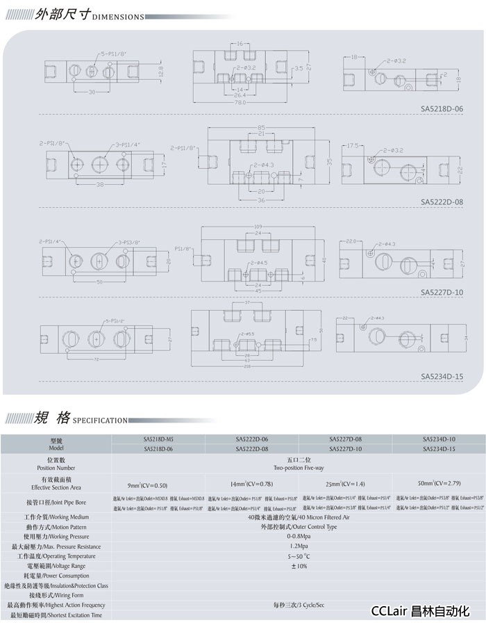 SA5222D-06,SA5218D-06,SA5227D-08,SA5234D-10,五口二位氣控閥