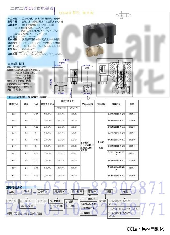 YCSM31021,YCSM31022,YCSM31023,YCSM31031,YCSM31032,二位二通直動式電磁閥