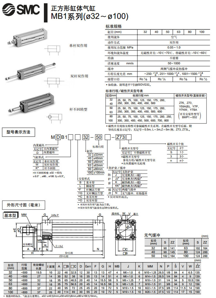MDB1KC80-450,MDB1KC80-500,MDB1KC80-600,MDB1KC80-700,MDB1KC80-800,MDB1KC100-25,MDB1KC100-50,MDB1KC100-75,SMC正方形缸體氣缸