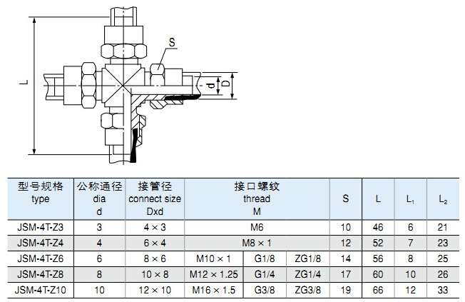 JSM-4T-Z3,JSM-4T-Z4,JSM-4T-Z6,JSM-4T-Z8,JSM-4T-Z10,鎖母式四通終端管接頭 |