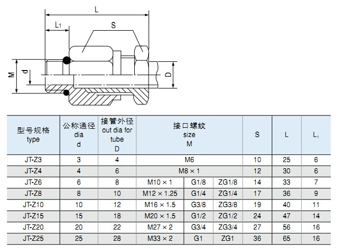 JT-Z3,JT-Z4,JT-Z6,JT-Z8,JT-Z10,JT-Z15,JT-Z20,JT-Z25,卡套式直通終端管接頭