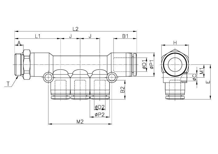 | Model | ∅D1 | ∅D2 | ∅P1 | ∅P2 | T | L1 | L2 | E | ∅C | A | B1 | B2 | J | M1 | M2 | H(Hex) | ORIFICE | WEIGHT(g) | EA(BOX) |