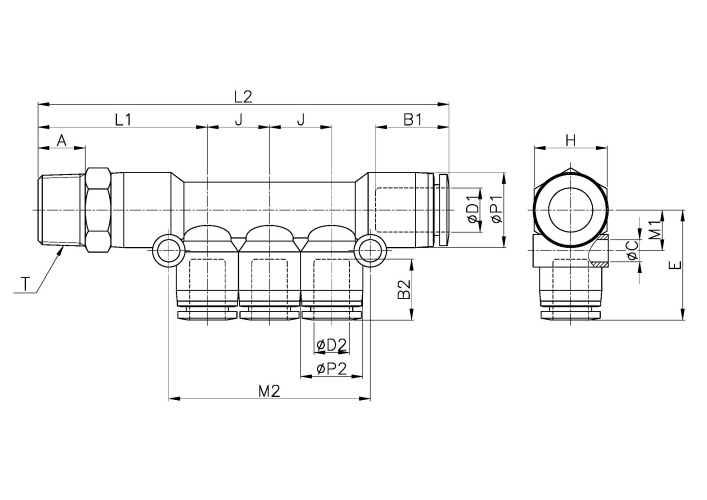 | Model | ¢D1 | ¢D2 | ¢P1 | ¢P2 | T | L1 | L2 | E | ¢C | A | B1 | B2 | J | M1 | M2 | H(Hex) | ORIFICE | WEIGHT(g) | BOX(EA) |
