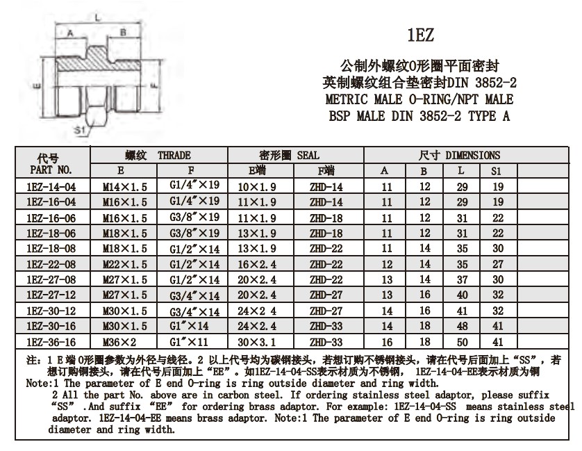 1EZ-14-04,1EZ-16-04,1EZ-16-06,1EZ-18-06,1EZ-18-08,1EZ-22-08,1EZ-27-08,平面密封接頭