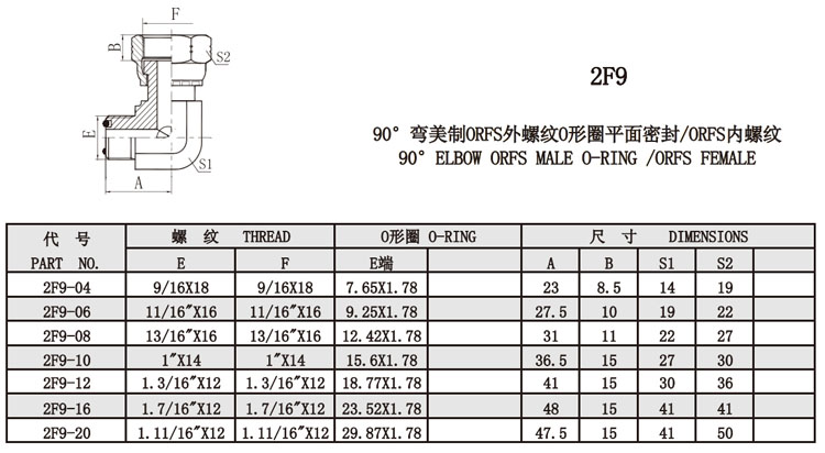 2F9-04,2F9-06,2F9-08,2F9-10,2F9-12,2F9-16,2F9-20,美螺紋O形圈密封接頭