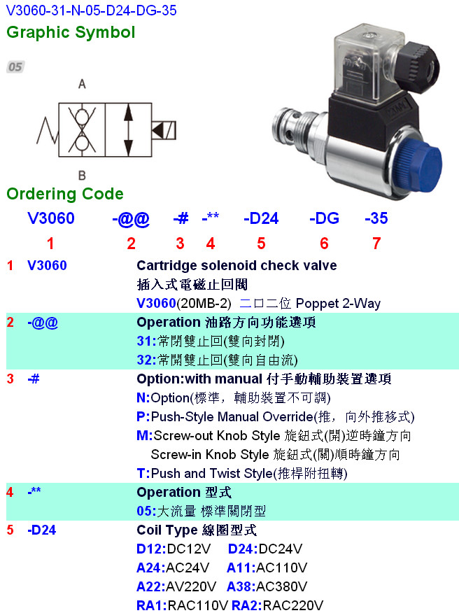 | V3060-31-N-05-D24-DG-35,V3060-31-N,V3060-31-P,V3060-31-M,V3060-31-T,HYDROMAX插入式電磁止回閥 |