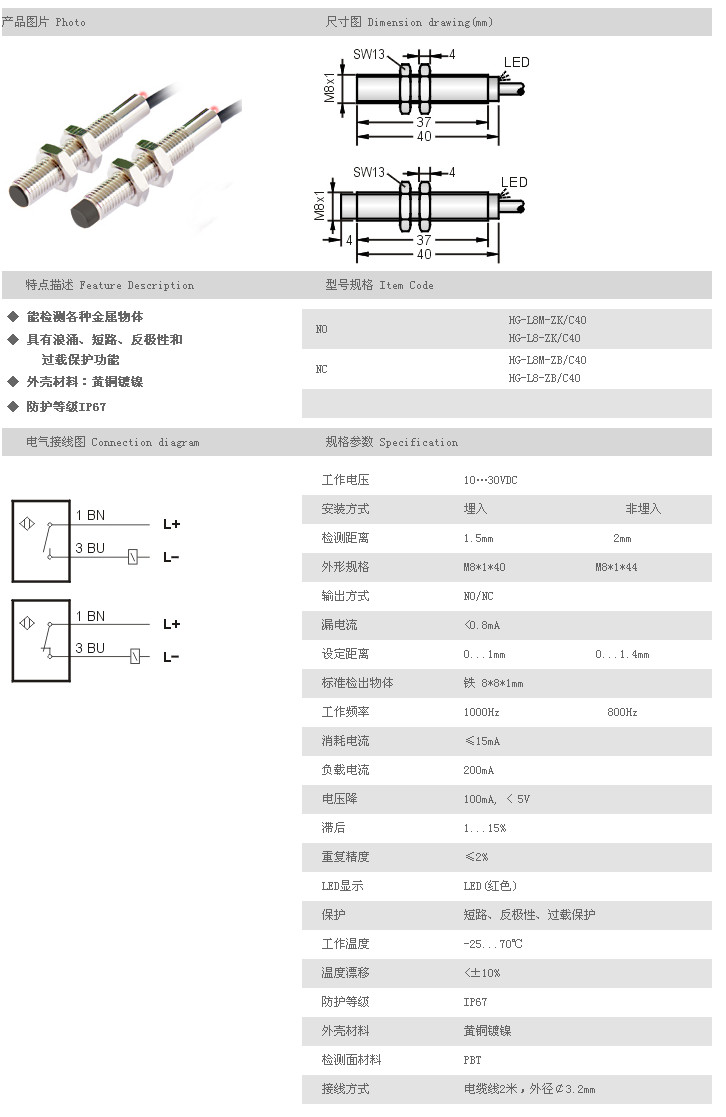 圓柱型接近開關(guān) HG-L8M-ZK/C40,HG-L8-ZK/C40,HG-L8M-ZB/C40,HG-L8-ZB/C40,