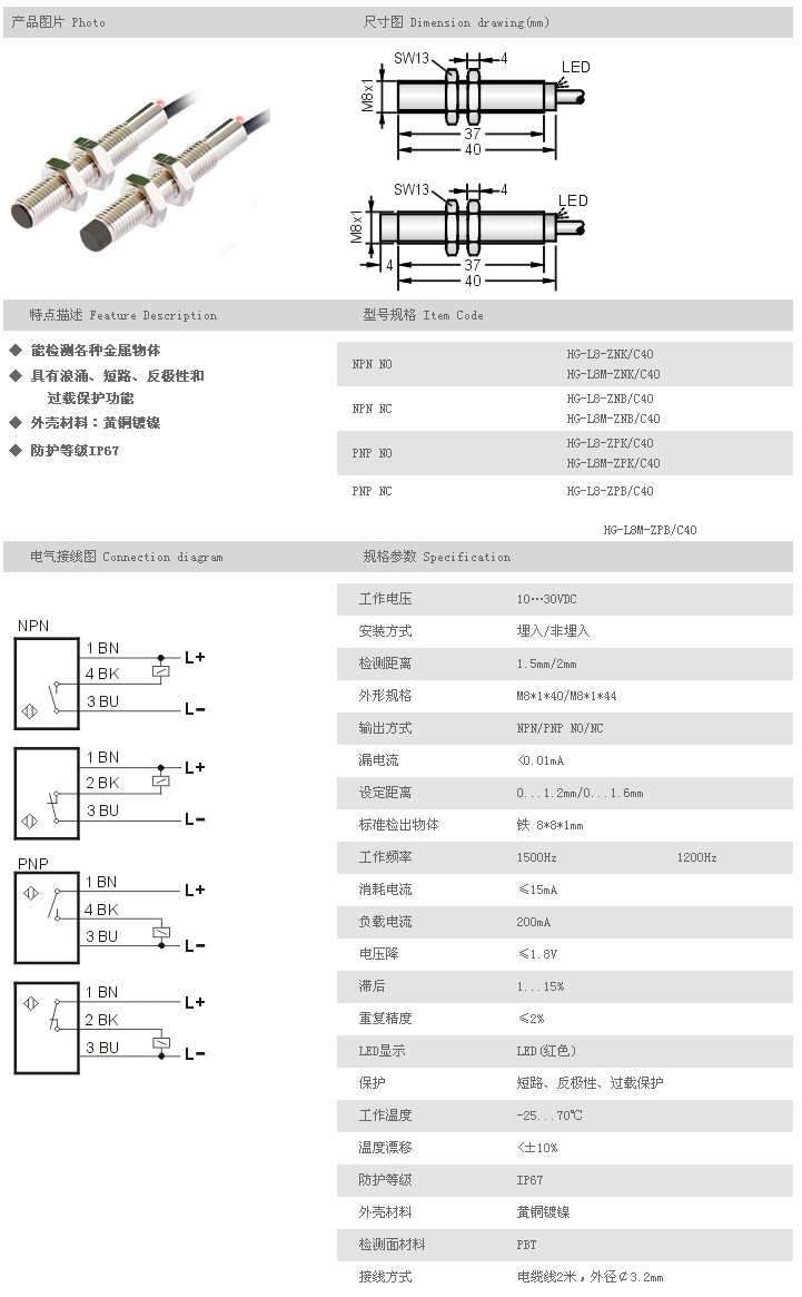 L8圓柱型接近開(kāi)關(guān) HG-L8-ZNK/C40,HG-L8M-ZNK/C40,HG-L8-ZNB/C40,HG-L8M-ZNB/C40,