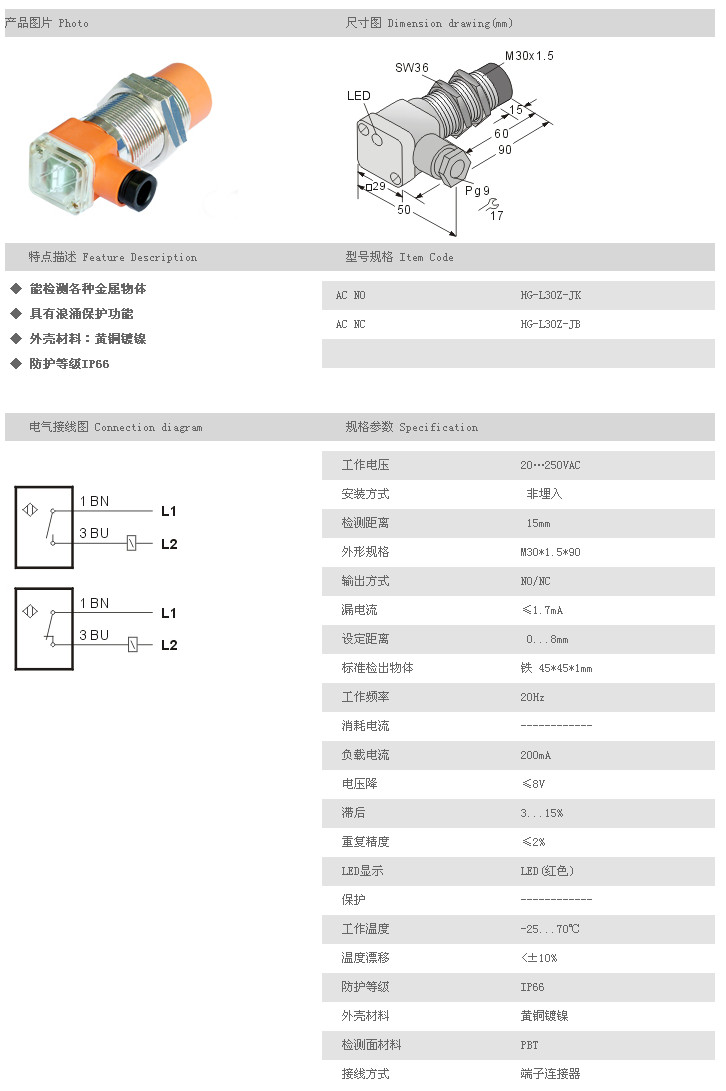 L30Z圓柱型接近開關(guān) HG-L30Z-JK,HG-L30Z-JB,