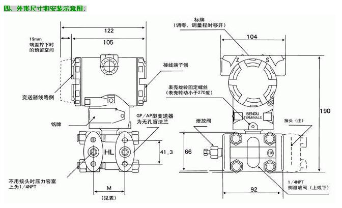 引壓連接件:在壓力容室上的連接法螺孔為1/4—18NPT,引壓接頭上的連接螺孔為1/2—14NPT,其中心距見各型號(hào)外型尺寸圖