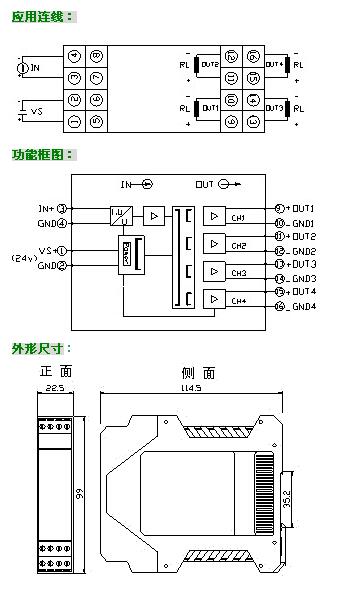 例:輸入4-20mA, 輸出4路信號:4-20mA,供電24VDC