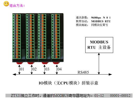 ZT321自帶一個(gè)RS485通訊口,內(nèi)部封裝了MODBUS協(xié)議,可以獨(dú)立工作,MODBUS從站地址等于從左向右排列的位置號(hào)。