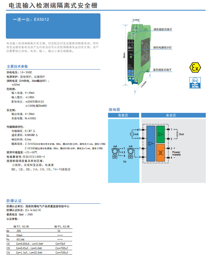 EX5012,電流輸入檢測端隔離式安全柵
