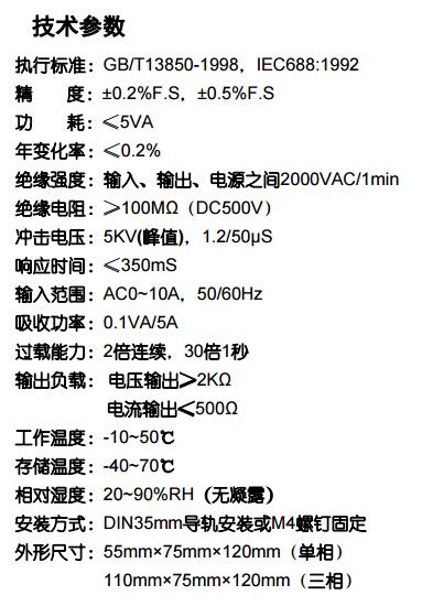 描述: 此型號(hào)為單相電流變送器,5Aac 電流互感器(CT)變比電流信號(hào)輸入,輸出4~20mAdc, 工作電源AC220V.