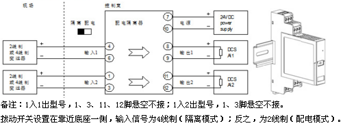MIK-502E系列信號(hào)隔離器兼容配電(無(wú)源輸入)和隔離(有源輸入)2種模式:配電(無(wú)源輸入)模式,向現(xiàn)場(chǎng)的2線制變送器提供工作電源,采樣變送器輸出的2線制電流信號(hào),經(jīng)過(guò)隔離處理后轉(zhuǎn)換為4線制電流信號(hào)輸出;隔離(有源輸入)模式,采樣4線制電流信號(hào),經(jīng)過(guò)隔離輸出4線制電流信號(hào)。通過(guò)產(chǎn)品上側(cè)內(nèi)置的撥動(dòng)開(kāi)關(guān)可設(shè)置輸入模式??蛇x1入1出、1入2出、2入2出。