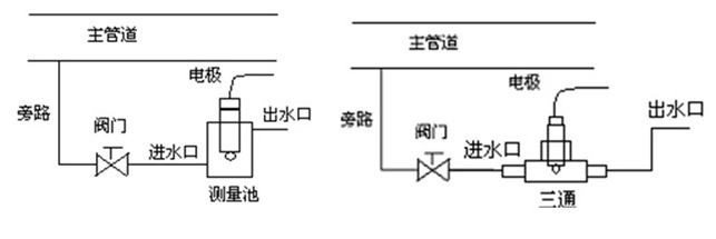 為保證電極在管路上正確測量出pH值,應避免測量池間出現(xiàn)氣泡而造成數(shù)據(jù)失準,請嚴格按下圖安裝:, ,