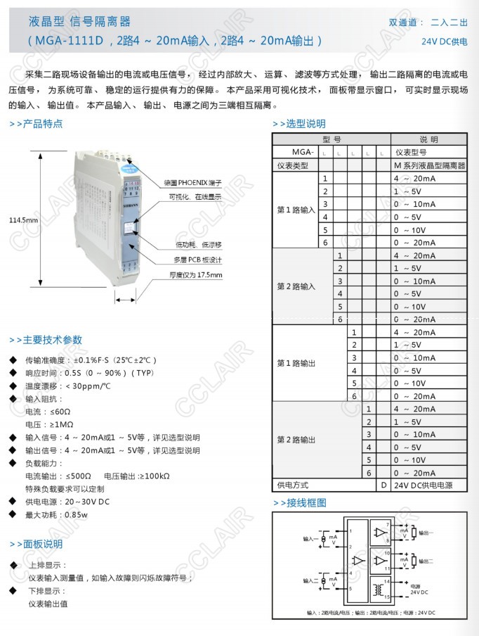 MGA-1132D,MGA-2463D,MGA-3411D,MGA-4535D,MGA-5246D,MGA-6665D,MGA-1111D,液晶型信號(hào)隔離器