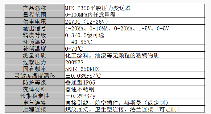 MIK-P350平膜壓力變送器: