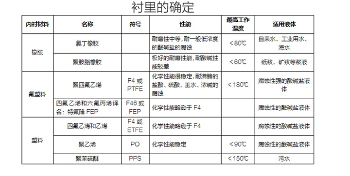襯里材料:氯丁橡膠(CR),聚全氟乙丙烯F46(FEP),聚四氟乙烯(PTFE),聚氨酯橡膠(PU),