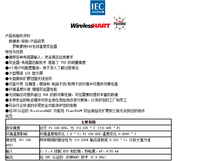 羅斯蒙特 648 無線溫度變送器包括一個大型易讀顯示屏、用戶可配置的過程警報、長距離和擴展范圍天線選項以及用于增強準(zhǔn)確性的變送器-傳感器匹配技術(shù)。 648 無線溫度變送器完全兼容經(jīng) IEC 認(rèn)證的 WirelessHART 網(wǎng)絡(luò),是一項可提供豐富診斷數(shù)據(jù)和可靠性能的智能無線溫度解決方案。