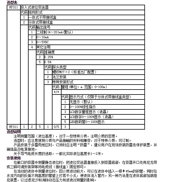 WP311型投入式液位變送器(也稱靜壓式液位變送器)選用進(jìn)口帶防腐膜片敏感組件,將芯片裝入一個(gè)不銹鋼(或聚四氟乙烯)殼體內(nèi)。頂部的鋼帽起保護(hù)傳感器的作用,也能使被測(cè)液體流暢地接觸到膜片。該產(chǎn)品采用特制的通氣電纜,使感壓膜片的背壓腔與大氣良好相通,測(cè)量液位不受外界大氣壓變化的影響,測(cè)量準(zhǔn)確,長(zhǎng)期穩(wěn)定性好,并具有優(yōu)良的密封及防腐性能,符合船用標(biāo)準(zhǔn),可直接投入到水、油等液體中長(zhǎng)期使用。聚四氟乙烯材料的外殼及電纜可測(cè)量多種強(qiáng)腐蝕性液體。