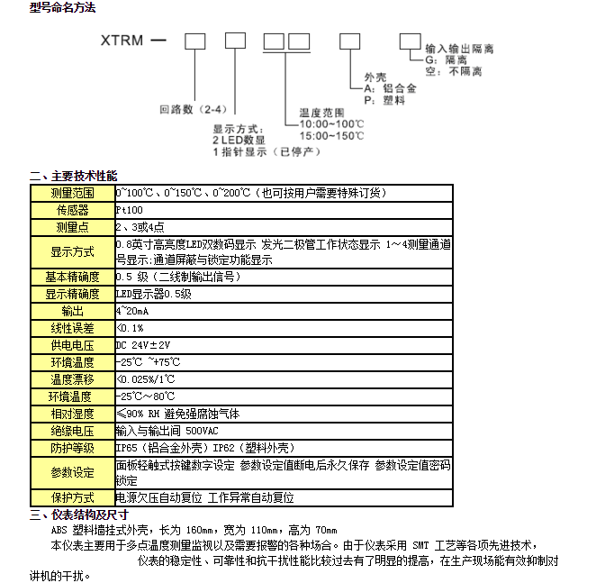 XTRM系列溫度遠傳監(jiān)測儀產品采用熱電阻測溫,輸出信號為四個測溫回路中最高的一個點,并以4-20mA的標準電流信號輸出,該儀表采用數字顯示,平時指示各個回路中最高一點的溫度。按面板上的通道鍵可顯示所對應通道的溫度。醒目又直觀,外殼采用ABS工程塑料外殼,適合環(huán)境相對惡劣場合,該產品采用二線制輸出,具有較強的抗干擾能力。輸入/輸出回路均采用光電隔離,具有良好的抗干擾能力。高亮度 LED 數碼顯示。整機采用壁掛式結構(長×寬×高=160×110×70mm),安裝十分 簡便。