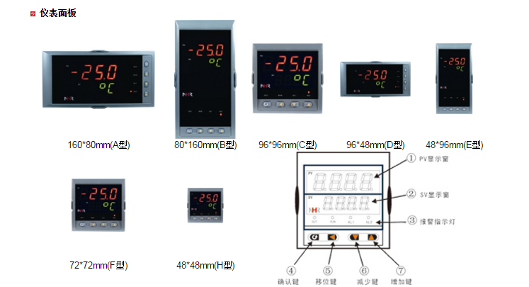 | NHR1100系列簡(jiǎn)易型單回路數(shù)字顯示控制儀采用模塊化結(jié)構(gòu)方案,結(jié)構(gòu)簡(jiǎn)單、操作方便、性價(jià)比高,適用于塑料、食品、包裝機(jī)械等行業(yè)。  單路輸入,雙屏LED數(shù)碼顯示。  具備33種信號(hào)輸入功能,可任意選擇輸入信號(hào)類型,測(cè)量精度為0.3%。  熱電阻\熱電偶信號(hào)分辨率可切換:1℃或0.1℃。  具備上下限報(bào)警功能,帶LED報(bào)警燈指示。  具有電壓、電流變送輸出信號(hào)可選。  支持RS485串行接口,采用標(biāo)準(zhǔn)MODBUS RTU通訊協(xié)議。  帶DC24V饋電輸出,為現(xiàn)場(chǎng)變送器配電。  輸入、輸出、電源、通訊相互之間采用光電隔離技術(shù)。  具備多種外形尺寸及樣式供用戶選擇。