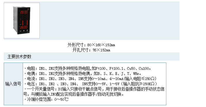 WP-KS805系列雙回路串級智能PID調(diào)節(jié)控制儀,具有5個模擬輸入(IN1-IN5)2個模擬輸出(OUT1、OUT2),一個開關量輸入DI,2個開關量輸出和豐富的控制算法,適用于鍋爐汽包水位三沖量控制或兩沖量控制并可帶汽包水位壓力補償功能適用于一般工業(yè)過程中溫度、壓力、液位、流量等各種過程參數(shù)的串級控制,前饋控制、雙路控制等,并可帶后備操作器,與后備控制器配套實現(xiàn)手動/自動無擾切換。