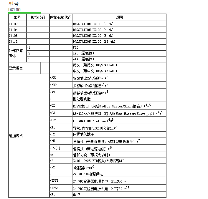 | *1 不能同時(shí)指定/AR1、/AR2和/A3。 *2 指定/AR1或/AR2后,不能指定/R1。 *3 指定/A3后,不能指定/F1。 *4 不能同時(shí)指定/C2、/C3和/CF1。 *5 使用Modbus Master功能,必須指定/M1。 *6 指定/CF1后,必須同時(shí)指定/M1。 *7 同時(shí)指定/P1和便攜式時(shí),必須指定/H5不能同時(shí)指定/P1和/H5[ ]。 *8 /H5[D、F、R或J ] D:電源線UL、CSA標(biāo)準(zhǔn) F:電源線VDE標(biāo)準(zhǔn) R:電源線SAA標(biāo)準(zhǔn) J:電源線BS標(biāo)準(zhǔn) *9 不能對(duì)DX102和DX104指定/N2 *10指定/TPS2后,不能指定/TPS4,/AR2或/A3。 *11指定/TPS4后,不能指定/TPS2,/AR2,/A3或/F1。 |