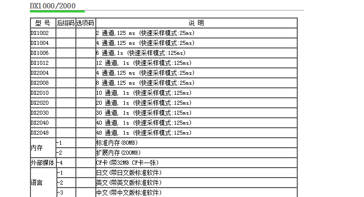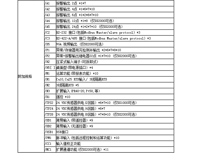 | *1 /A1,/A2,/A3,/A4,/A5以及/F2不能同時選用 *2 /A3和/F1不能同時選用(僅對DX100), /A5和/F1不能同時選用(僅對DX200) *3 /C2,/C3以及/CF1不能同時選用 *4 /H5[ ] D:電源插口 UL,CSA 標(biāo)準(zhǔn) F:電源插口 VDE 標(biāo)準(zhǔn) R:電源插口 SAA 標(biāo)準(zhǔn) J:電源插口 BS 標(biāo)準(zhǔn) H:電源插口 GB 標(biāo)準(zhǔn) *5 DX1002,DX1004,DX2004,DX2008 不能選用/N2 *6 選用了/TPS2, 就不能選用 /TPS4, /A2, /A3或 /F1(僅對DX1000) *7 DX1000: 選用了/TPS4, 就不能選用 /TPS2, /A1, /A2, /A3或 /F1 DX2000: /TPS4, /TPS8, /A5, /F2不能同時指定 *8 選用了/TPS8, 就不能同時選用/F1和/A4 *9 /KB1, /KB2不能同時指定,指定/KB1時,附帶1臺遙控器(438227) *10 DX1000: 指定/PM1時,不能指定/A3, /M1, /R1, /TPS2, /TPS4。另外/A2, /F1不能同時指定 DX2000: 指定/PM1時,不能指定/A5, /F2, /M1, /R1。另外/A2, /F1和/A4, /TPS8不能同時指定 *11 只能對DX2010,DX2020,DX2030,DX2040,DX2048指定/MC1 |