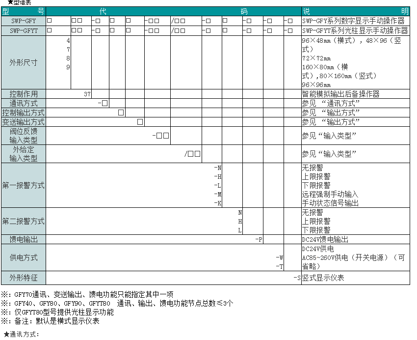 SWP-GFY系列數(shù)字/光柱顯示智能模擬輸出操作器接收從DCS系統(tǒng)或智能調(diào)節(jié)器來(lái)的0-10mA/4-20mA/0-5V/1-5V閥位給定輸出信號(hào),再由伺服放大器去驅(qū)動(dòng)電動(dòng)調(diào)節(jié)閥門(mén)或由電氣轉(zhuǎn)換器和閥門(mén)定位器去驅(qū)動(dòng)氣動(dòng)薄膜閥,適合于作為DOS系統(tǒng)回路調(diào)節(jié)控制輸出和智能調(diào)節(jié)器控制輸出的后備操作器使用。
