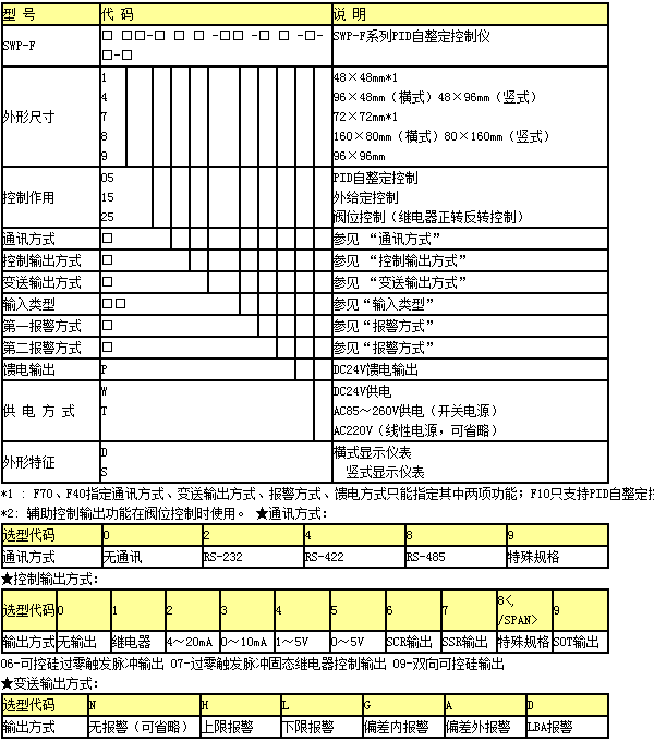 SWP-F系列人工智能調(diào)節(jié)器精度0.2%,采樣周期最短0.25秒,手/自動(dòng)切換,內(nèi)給定/外給定SV切換,可設(shè)定兩種PID調(diào)節(jié)模式:TYPEA、TYPEB。事件輸出最多2點(diǎn)(偏差、PV、︱偏差︱、SV、控制輸出、馬達(dá)反饋回路、控制回路診斷報(bào)警)。它可根據(jù)SV值范圍進(jìn)行PID參數(shù)切換。它還支持RS-232、RS485通訊兼容MODBUS協(xié)議。